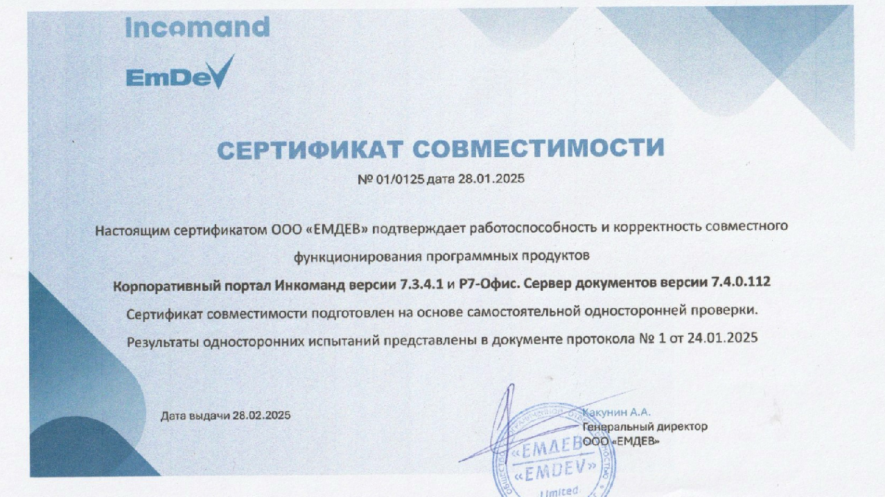 ООО "ЕМДЕВ" полностью несёт ответственность за дальнейшую эксплуатацию программных продуктов в описанной и протестированной им среде.